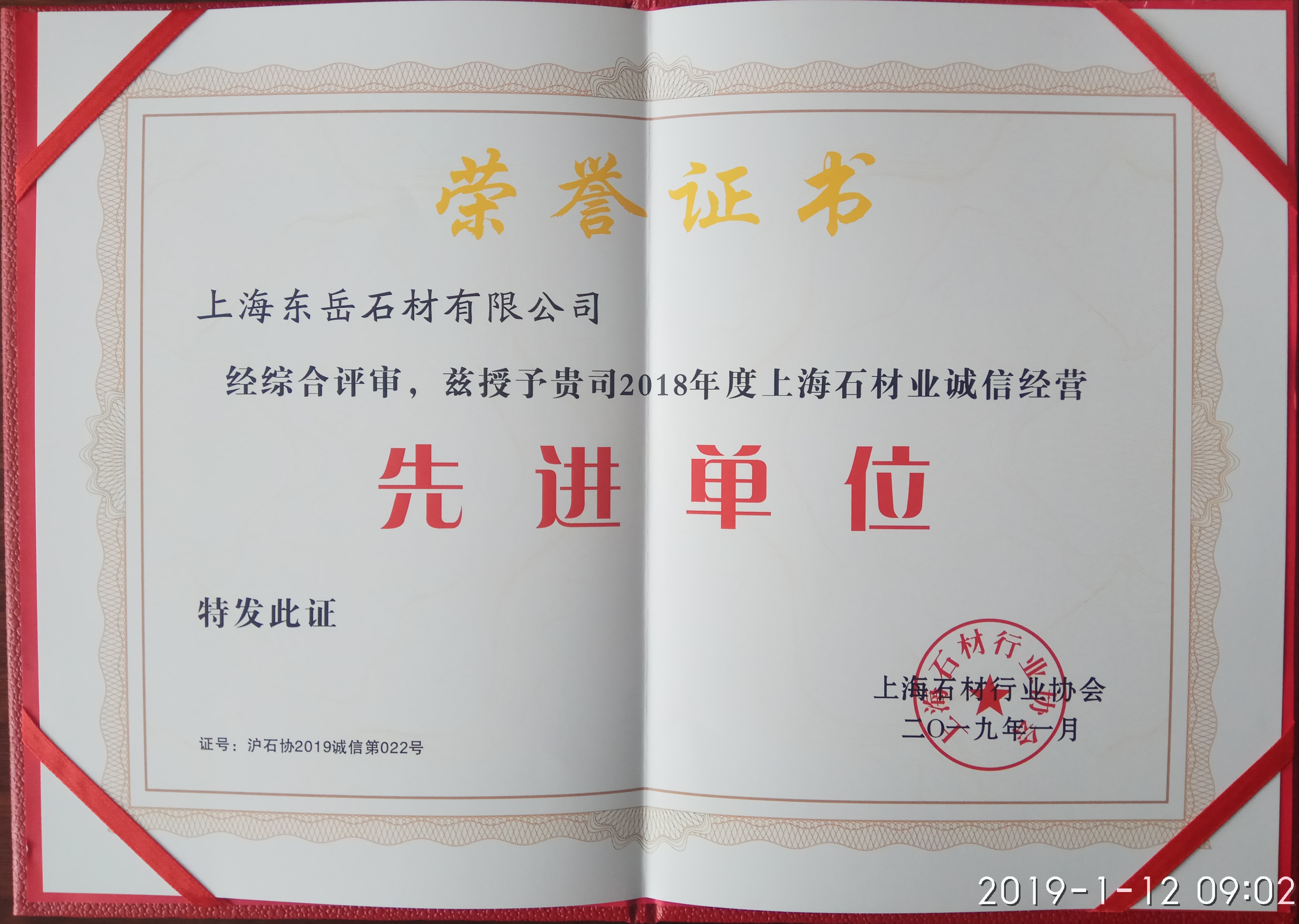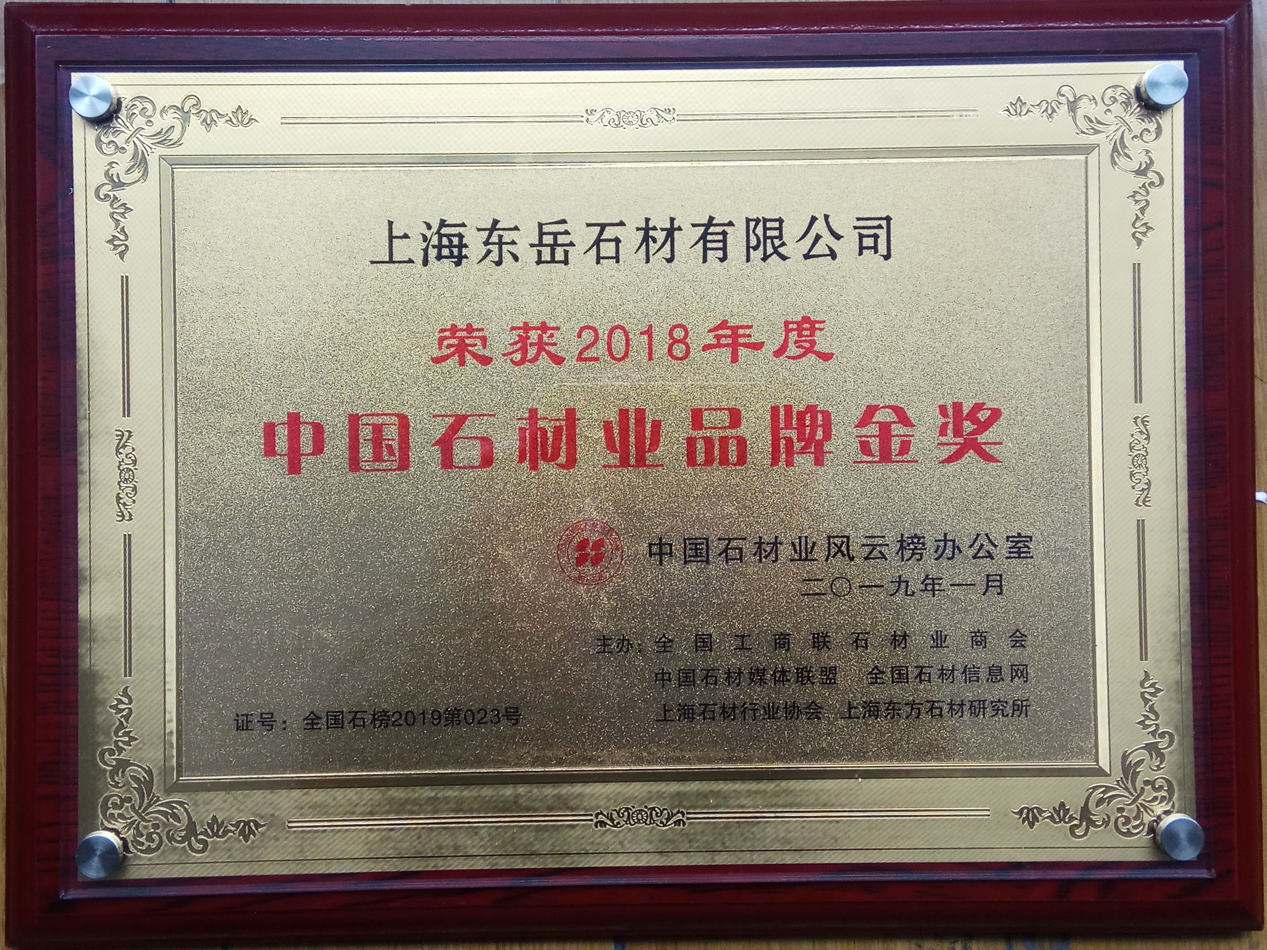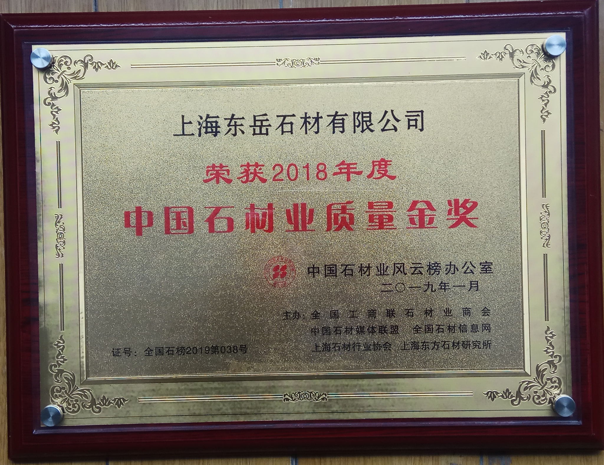 上海東岳石材有限公司榮獲2018年度石材行業(yè)品牌金獎(jiǎng)、2018年度石材行業(yè)質(zhì)量金獎(jiǎng)、2018年度石材業(yè)誠(chéng)信經(jīng)營(yíng)先進(jìn)單位,這是全體東岳人共同努力、共同奮斗的結(jié)果,也是業(yè)界對(duì)我們的肯定,希望公司全體同仁繼續(xù)加油!